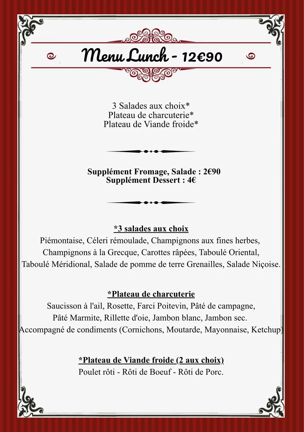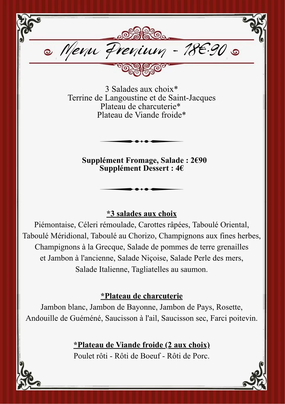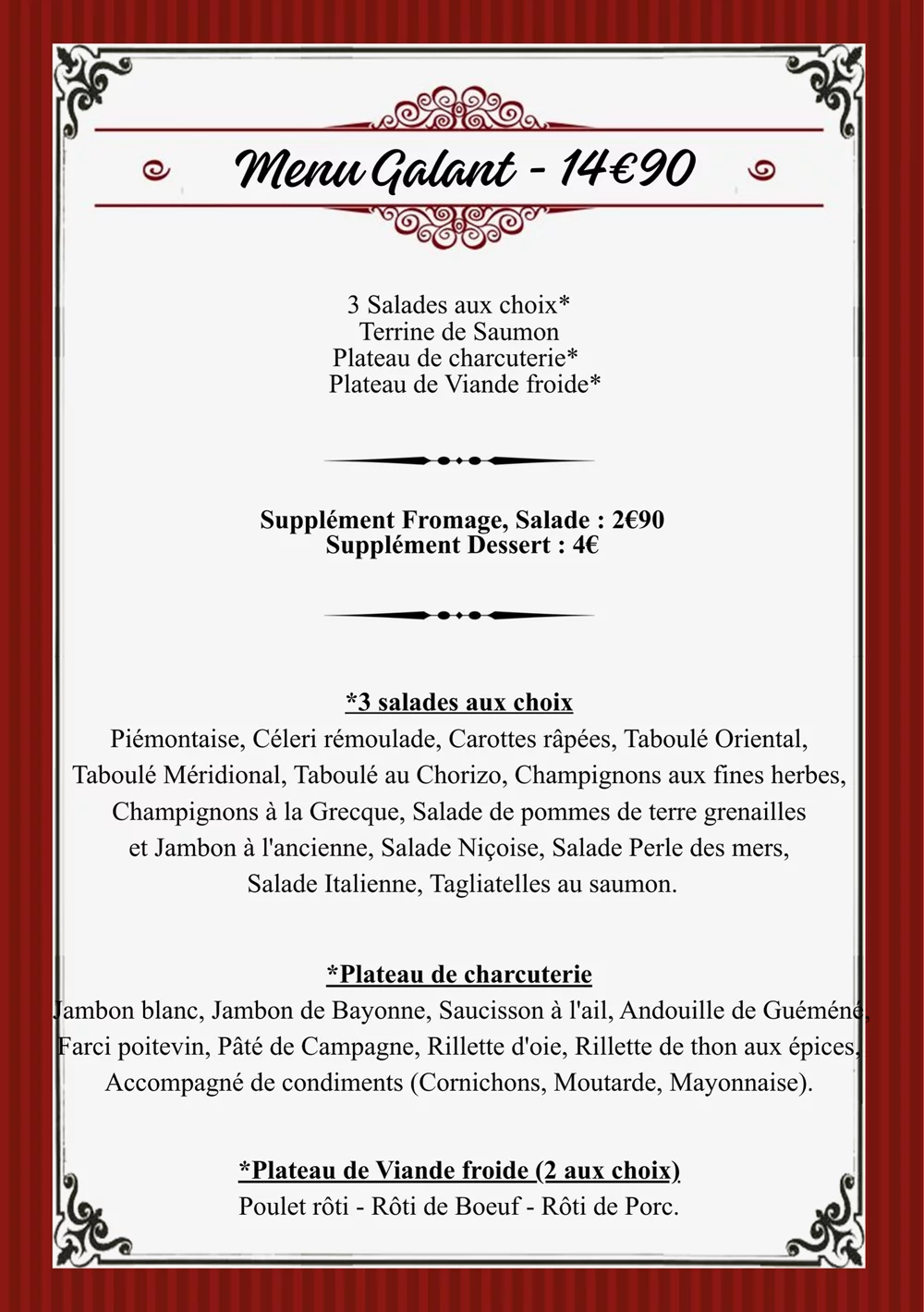 Découvrez nos compositions gourmandes de haute qualité : salades variées au choix, plateaux de charcuterie artisanale (jambons, saucissons, terrines maison), plateaux de viandes froides...